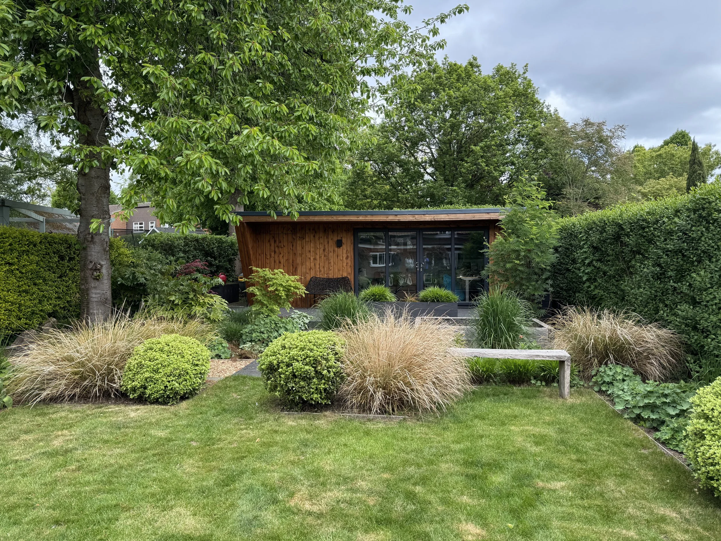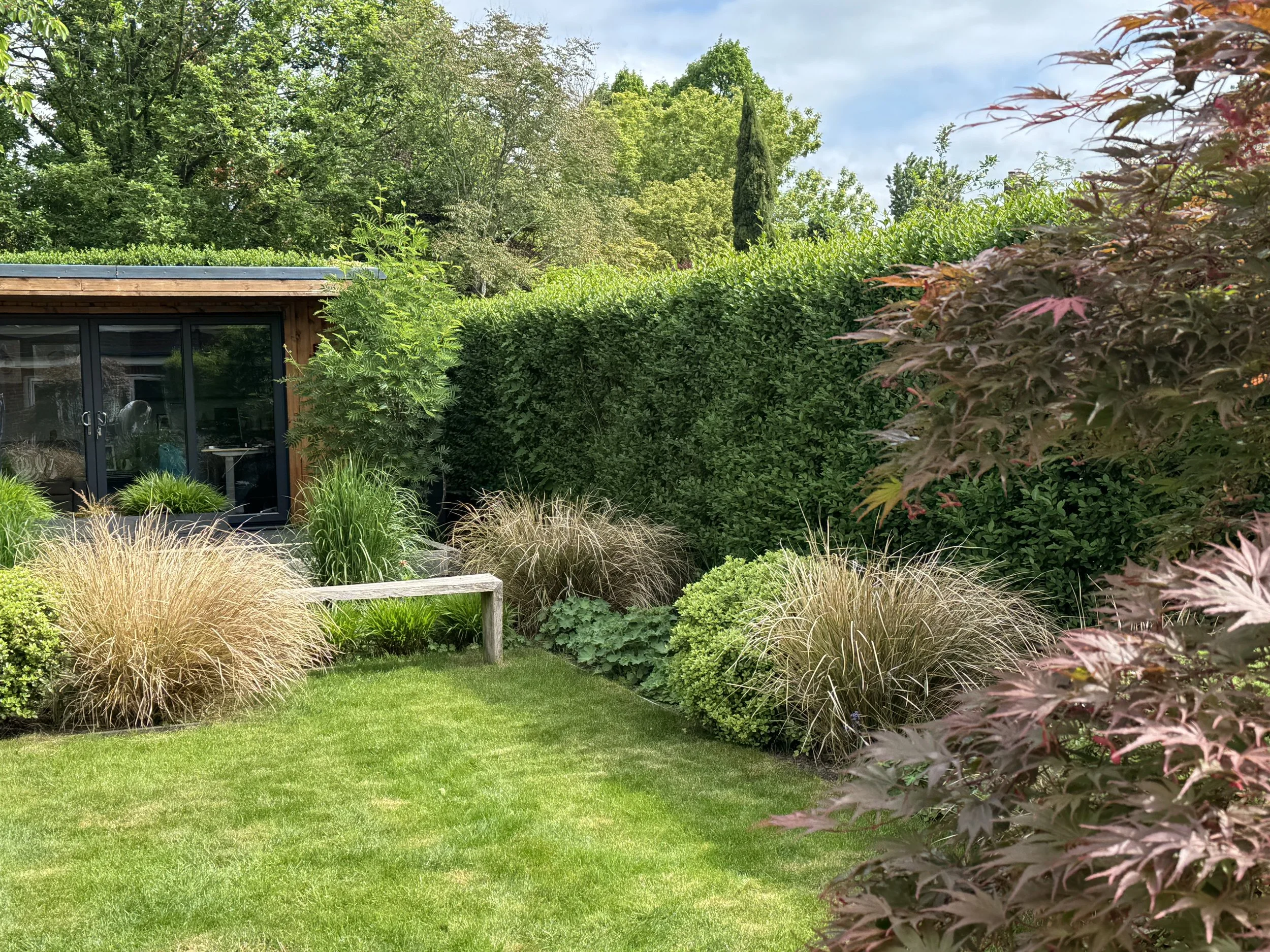 The planting is kept formal nearer to the house around the entertaining area, progressing to relaxed planting around the lawn area using shrubs and low maintenance perennials, moving to a more lush, Asian inspired shade planting around the studio.