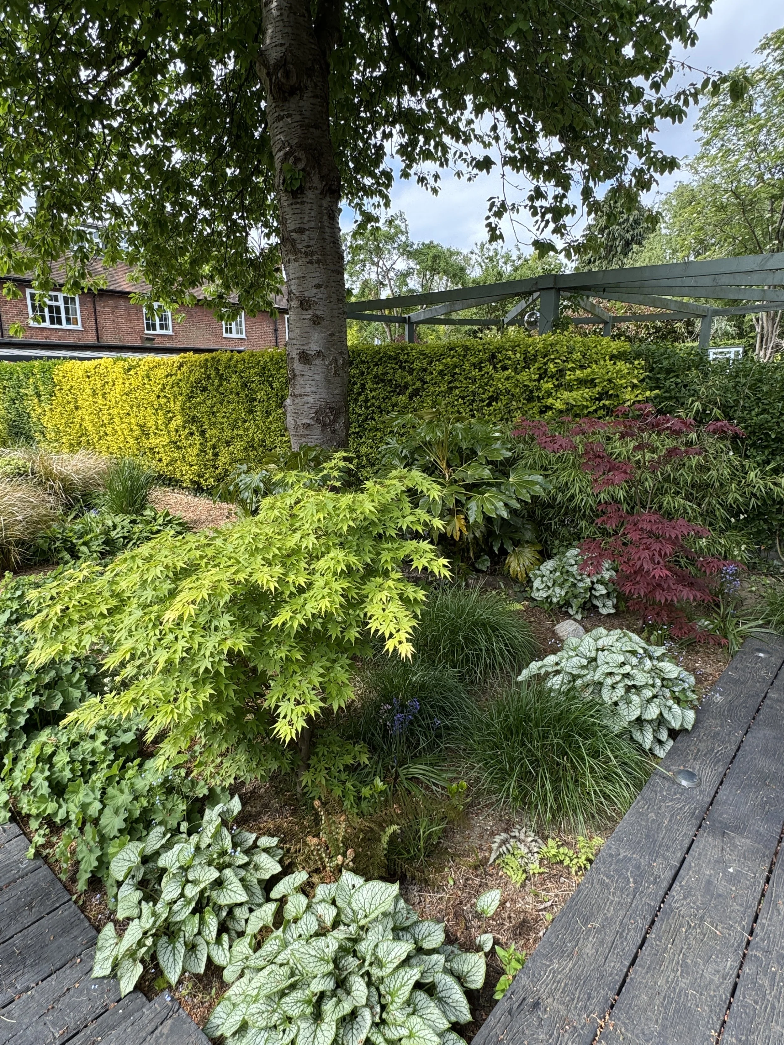 The studio at the rear of the garden leads out onto a timber deck - using a dark coloured timber inspired by the Japanese process of Yakisugi, the age-old method of enhancing timber with heat. This provides a long lasting, child & pet friendly, unique coloured decking that will contrast with the natural colour of the studio. Timber decking will also be used as a boardwalk, crossing into the more Japanese inspired planting area towards the studio.