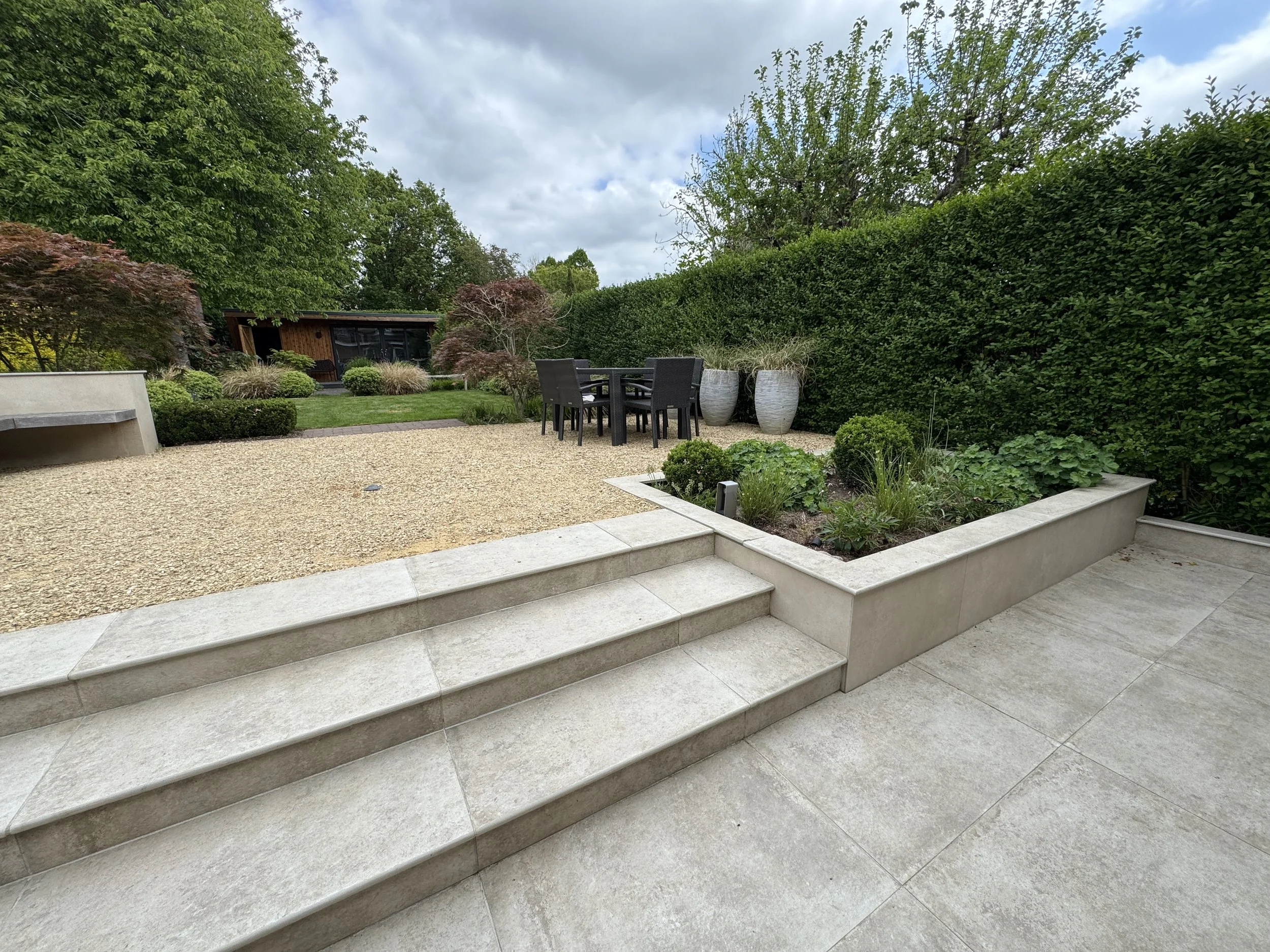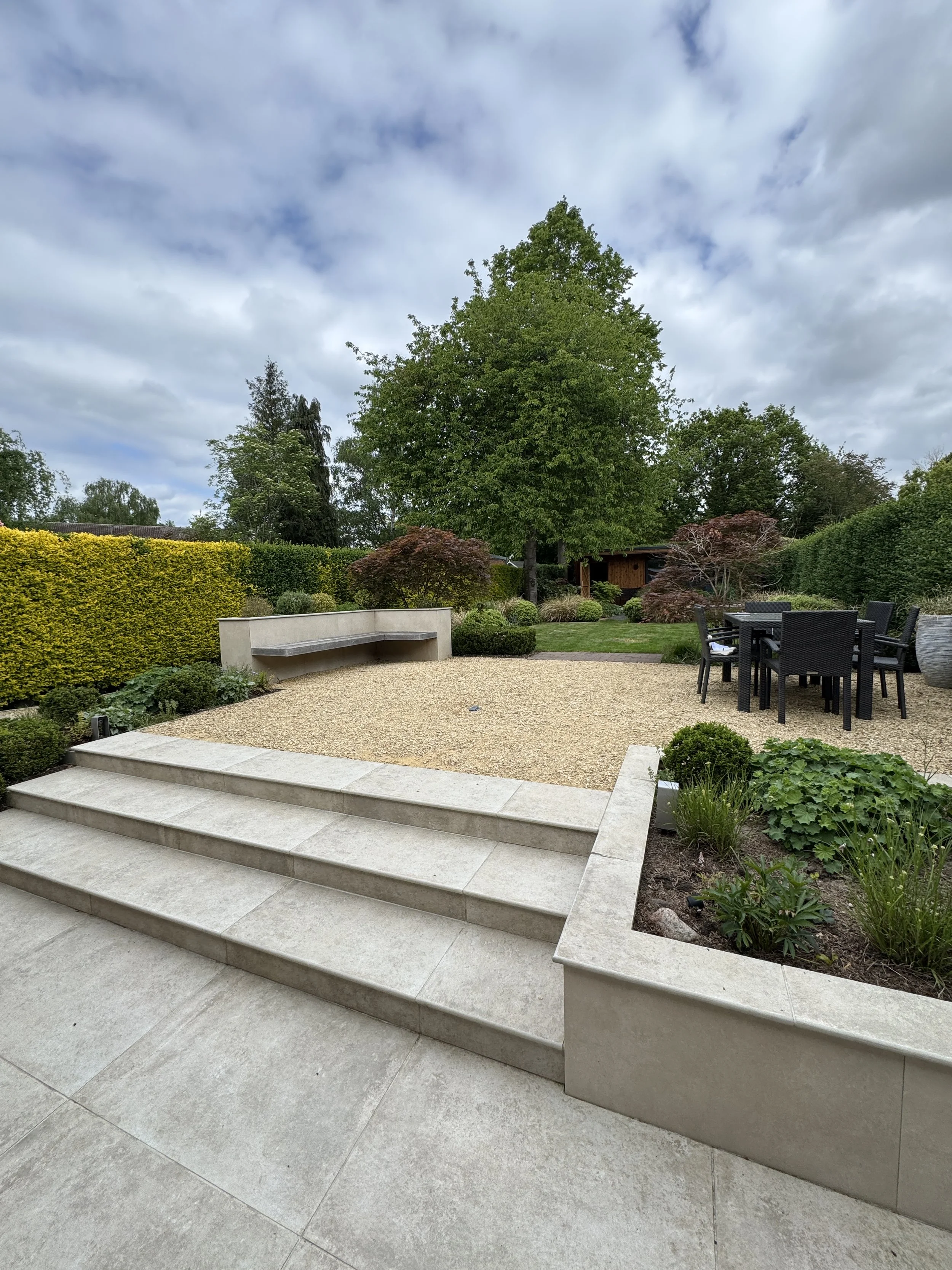 The hard landscaping is kept to a light beige colour nearer the house, giving the overall outlook onto the garden a light, crisp feel. Porcelain laid to a grid pattern will give this a sharp, modern look but kept to a traditional style, blending with the house by having bullnose edging. Textures are explored by using light coloured pavers at the threshold to the lawn and using compressed gravel for the larger terrace area and pathways.
